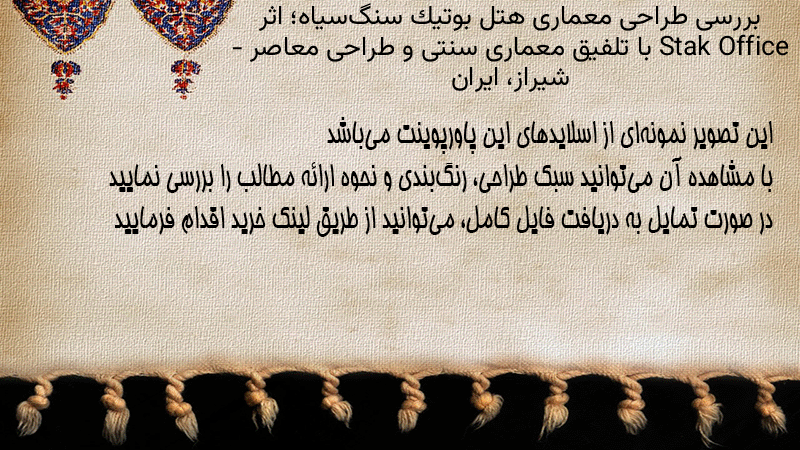 پاورپوینت کامل بررسی طراحی معماری هتل بوتیک سنگسیاه؛ اثر Stak Office با تلفیق معماری سنتی و طراحی معاصر – شیراز، ایران
