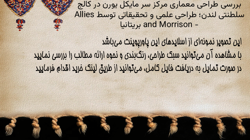 پاورپوینت کامل بررسی طراحی معماری مرکز سر مایکل یورن در کالج سلطنتی لندن؛ طراحی علمی و تحقیقاتی توسط Allies and Morrison – بریتانیا