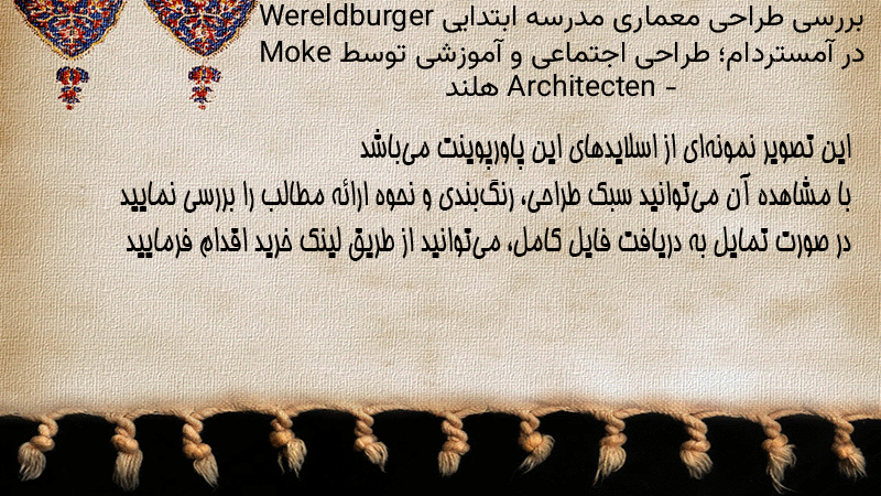 پاورپوینت کامل بررسی طراحی معماری مدرسه ابتدایی Wereldburger در آمستردام؛ طراحی اجتماعی و آموزشی توسط Moke Architecten – هلند