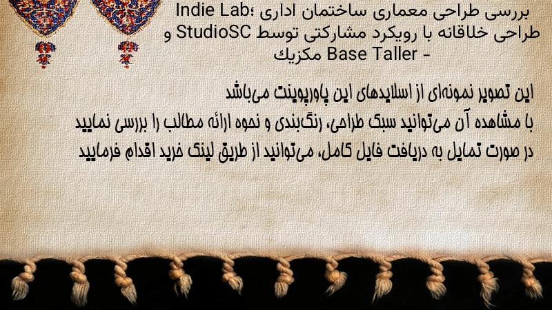 پاورپوینت کامل بررسی طراحی معماری ساختمان اداری Indie Lab؛ طراحی خلاقانه با رویکرد مشارکتی توسط StudioSC و Base Taller – مکزیک