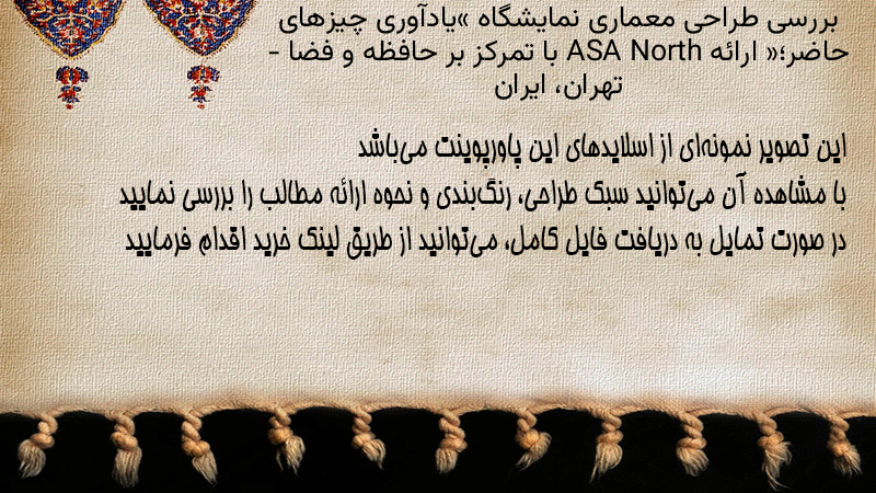 پاورپوینت کامل بررسی طراحی معماری نمایشگاه «یادآوری چیزهای حاضر»؛ ارائه ASA North با تمرکز بر حافظه و فضا – تهران، ایران